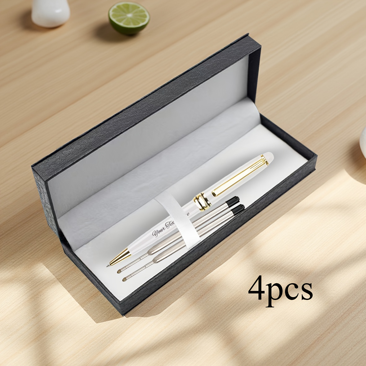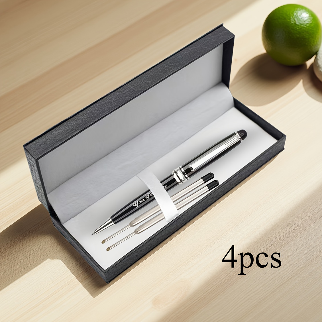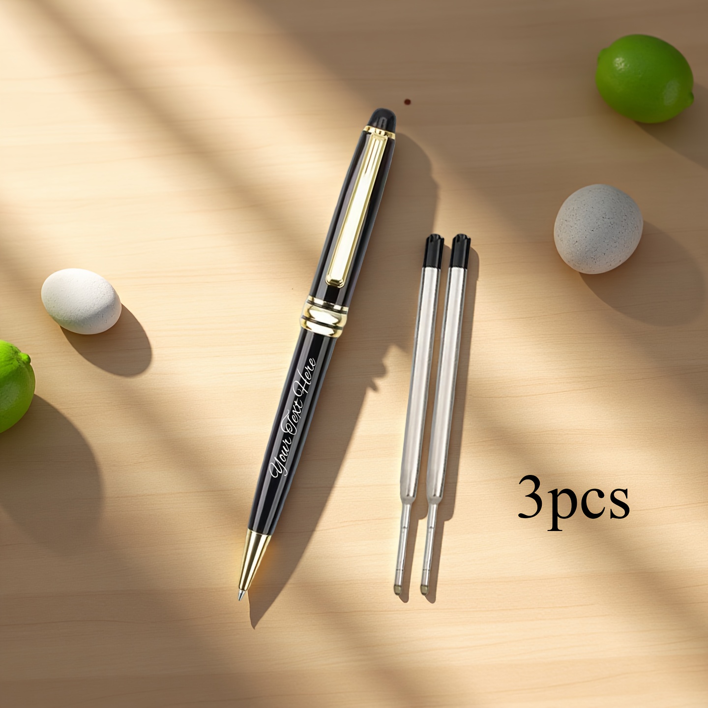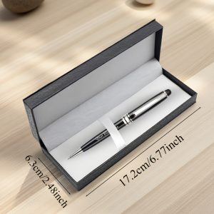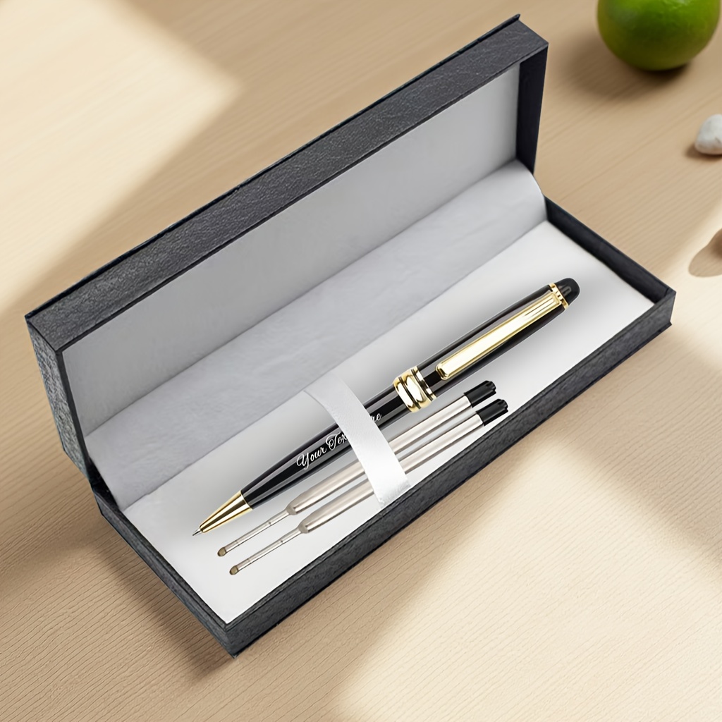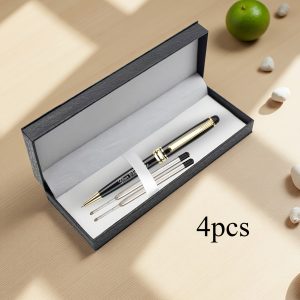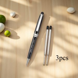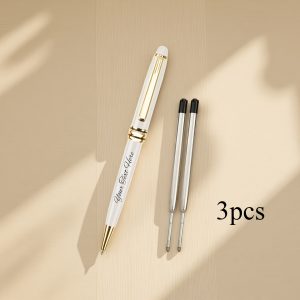 Product Details: Includes 1 pen, 2 refills, and 1 gift box; a luxurious ballpoint pen set in gold and silver – a stylish executive pen featuring metal details, smooth writing refills, perfect for corporate gifts, Refillstide pens, and Writech pens. Customization: We utilize laser engraving to personalize the pen’s text, ensuring it remains vibrant. Simply select the ‘Customize’ option for easy personalization. It presents beautifully and is ideal for gifting. Features: 1 pen, 2 refills, and 1 cable gift box.